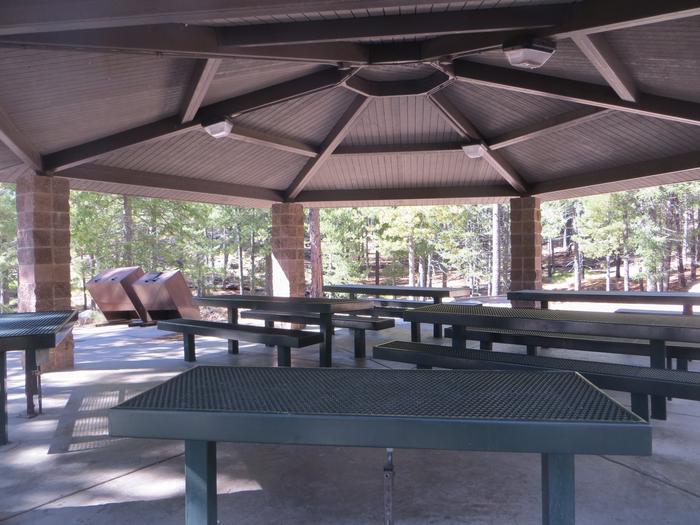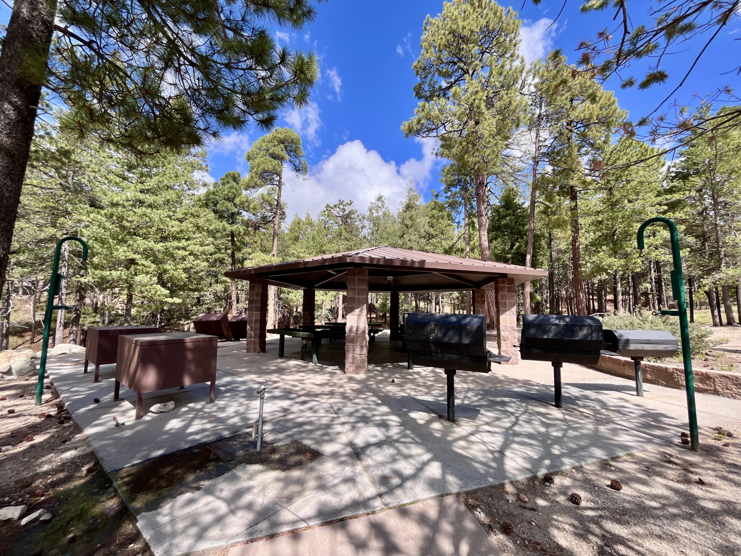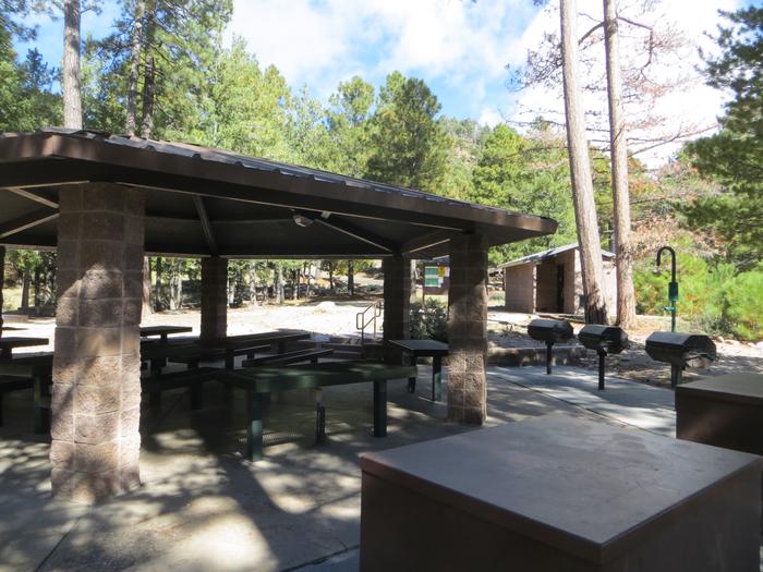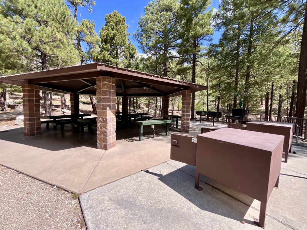 These campsites have large fire pits, large grills, tables, ramada with picnic tables, a 120-volt outlet (small appliances only), and bear boxes. Each site has a clean, stocked restroom. Drinking water is available at this site.