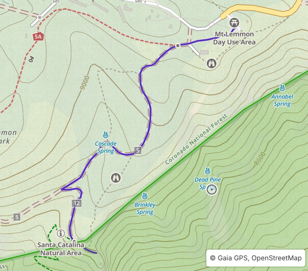 From Palisades Visitor Center continue up Catalina Highway towards Summerhaven for 4.5 miles and make a right on Ski Run Road. (If you arrive in Summerhaven you’ve gone too far.) Follow Ski Run Road for 3.2 miles, passing Ski Valley, and winding upward to where the road ends at the Mount Lemmon Recreation Area. Park here. (Parking can be crowded on weekends.) The trail begins on the west side of the parking lot running through a small stand of Aspens next to a chainlink fence.