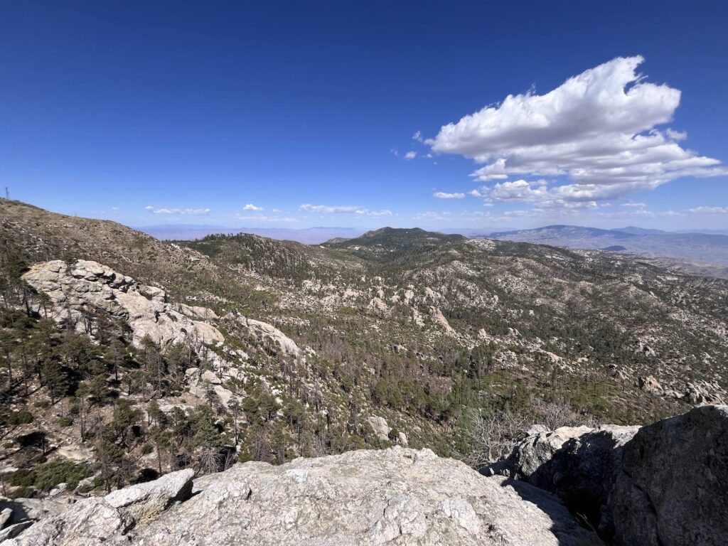 At the start of the hike you will quickly reach a junction where Meadow Trail heads to the right and the Mount Lemmon Trail, which looks like a dirt road, goes to the left. Stay left on Mount Lemmon Trail. The trail descends for .5 miles, and then junctions with the Lemmon Rock Lookout Trail on the left. Make a sharp left onto this trail. There is no sign, so keep an eye out for this turn. The Lemmon Rock Lookout Trail is a level, double track trail.