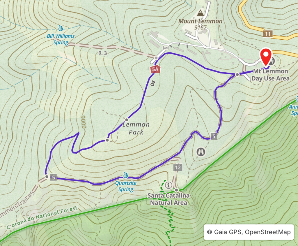 Note: The Meadow Loop hike departs from the Mount Lemmon Recreation Area which is location at the end of Ski Run Road. Ski Run Road is closed annually from December 15 to March 1, with the closure sometimes being extended into April if winter conditions persist.
