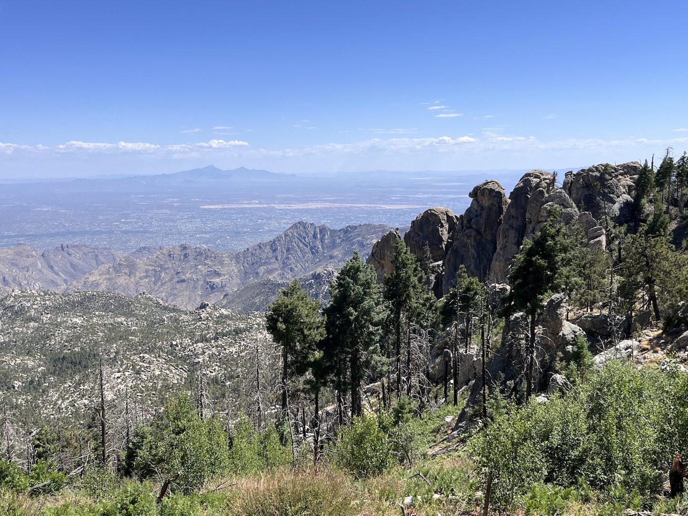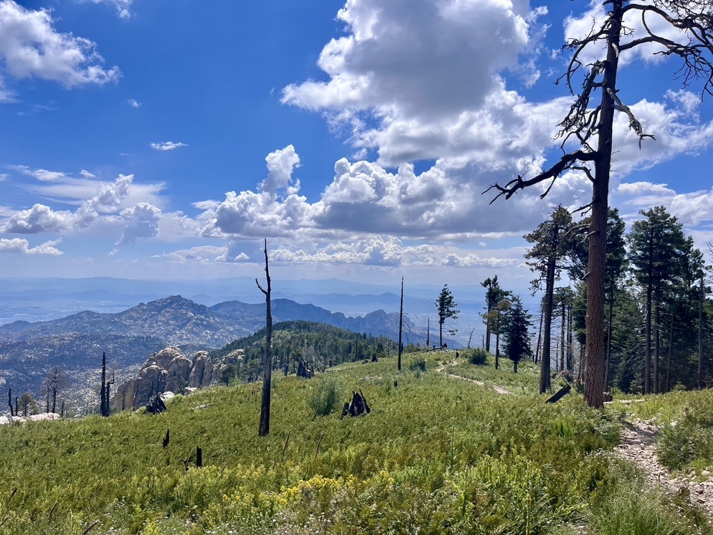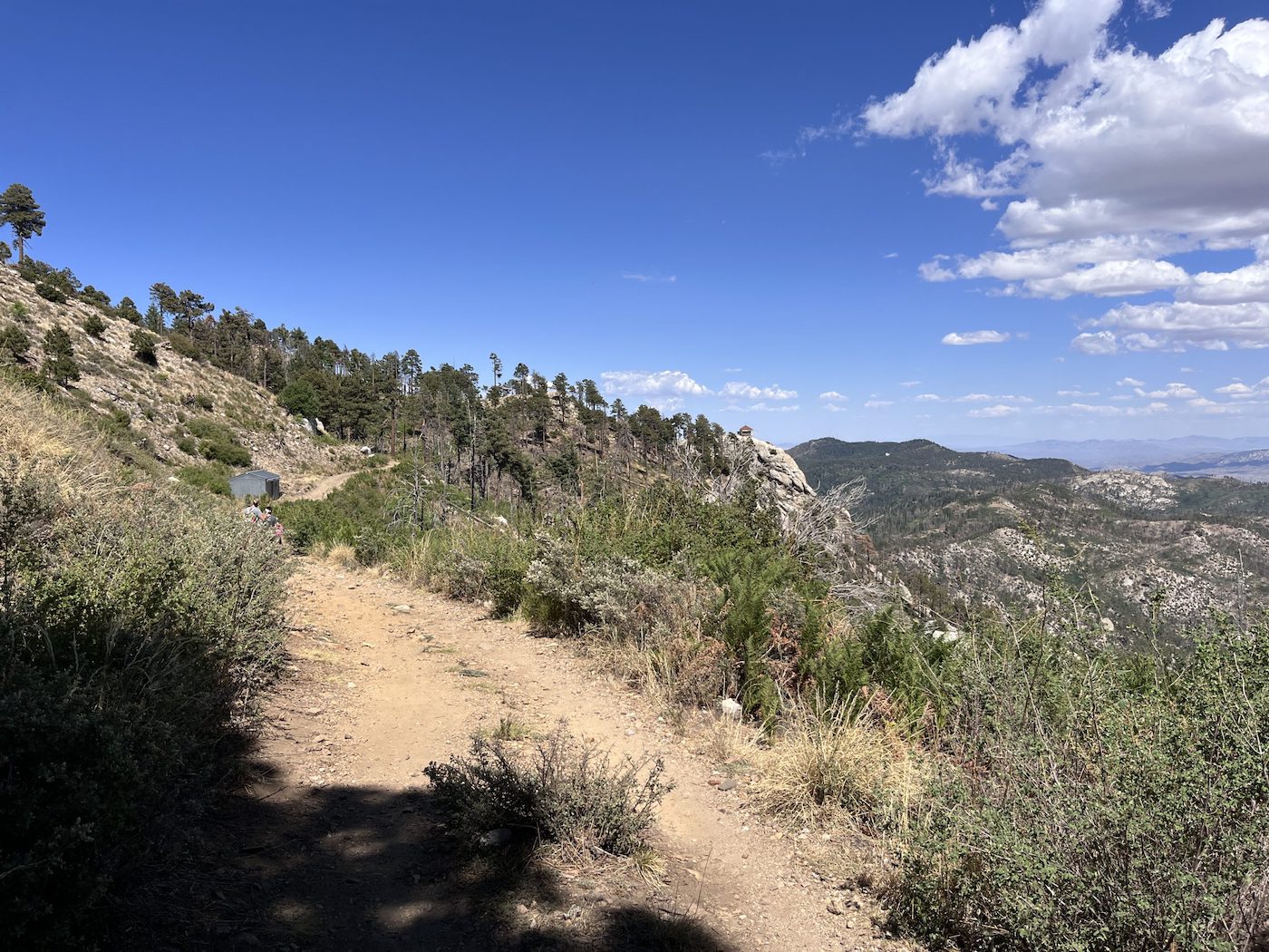 At the start of the hike you will quickly reach a junction where Meadow Trail heads to the right and the Mount Lemmon Trail, which looks like a dirt road, goes to the left. Stay right on Meadow Trail. As the trail contours around you will see buildings uphill to your north. These are part of the Mt Lemmon Observatory quarters. As the trail wraps back to the south, large trees give way to a meadow and a clear view to the south will begin opening up presenting an expansive view down the mountain’s hillside. At certain times of year the meadow will have a variety of wildflowers and an occasional raspberry bush giving the space pops of vibrant colors. Many visitors choose to end their hike here, enjoy the scenery, and eventually return back the way you came.