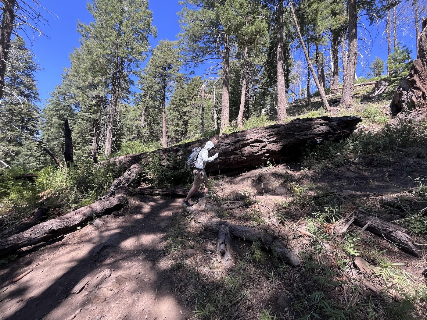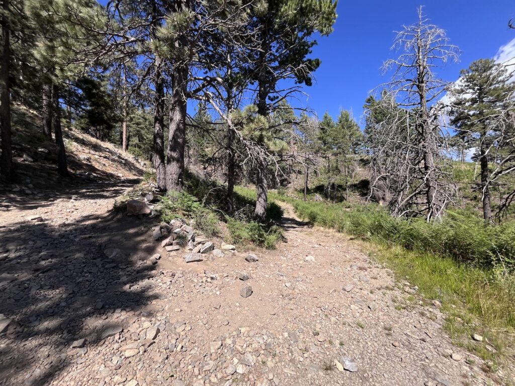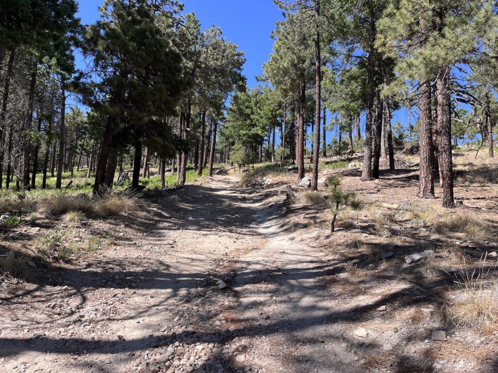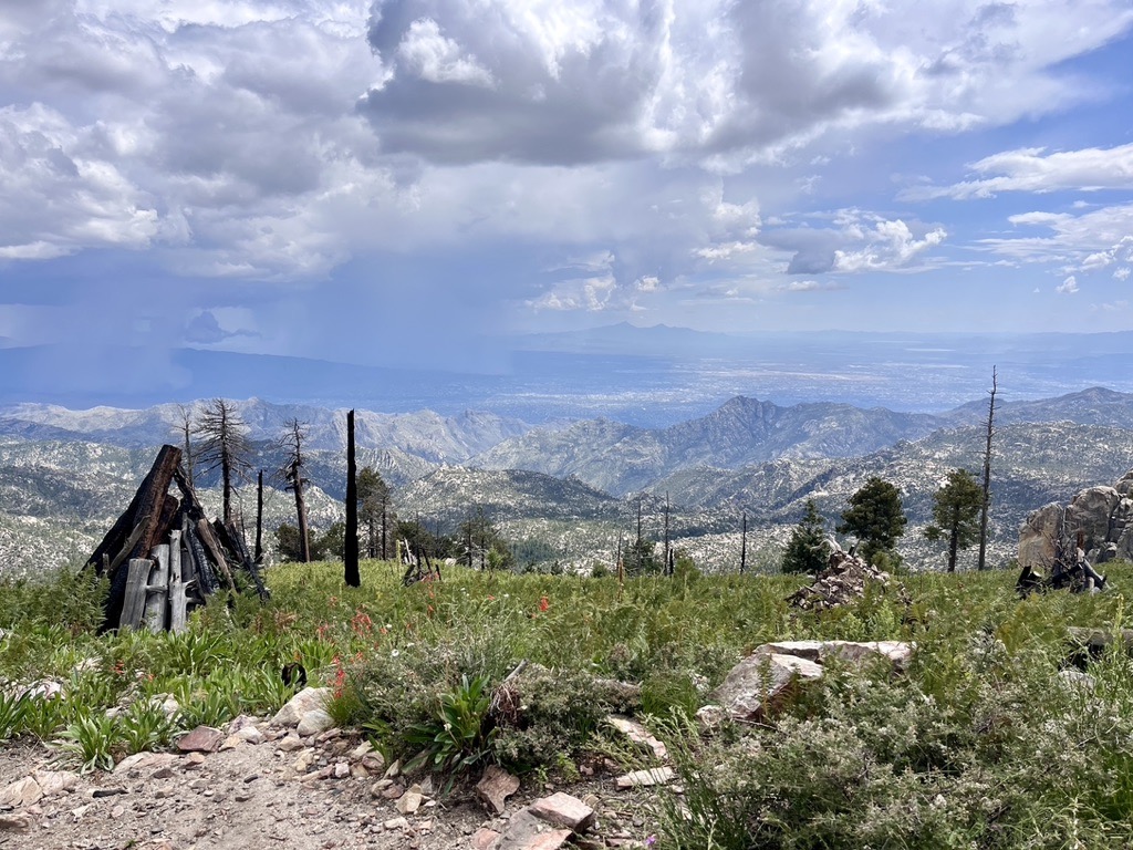 At the start of the hike you will quickly reach a junction where Meadow Trail heads to the right and the Mount Lemmon Trail, which looks like a dirt road, goes to the left. Stay right on Meadow Trail. As the trail contours around you will see buildings uphill to your north. These are part of the Mt Lemmon Observatory quarters. As the trail wraps back to the south, large trees give way to a meadow and a clear view to the south will begin opening up presenting an expansive view down the mountain’s hillside. At certain times of year the meadow will have a variety of wildflowers and an occasional raspberry bush giving the space pops of vibrant colors. Many visitors choose to end their hike here, enjoy the scenery, and eventually return back the way you came.