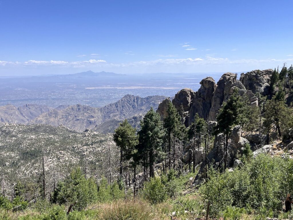 If you wish to press on, you can turn the hike into a 1.6 mile loop by connecting to Mt Lemmon Trail. To do this continue southwest on Meadow Trail. Up to this point the trail has been mostly flat, but here the trail will begin to descend back into the shade of some large evergreens switchbacking down to the intersection of Mt Lemmon Trail. Go east (left) on Mt Lemmon Trail. The path is wide and continues to offer stunning views to the south. The trail will take you passed a small spring and then to a junction with Lemmon Rock Lookout Trail #12. (If you’d like to visit the Lookout you can do a half mile side hike down Lemmon Lookout Trail. The building itself is not open to visitors.) Once passed the Lemmon Lookout Trail junction the Mount Lemmon Trail begins climbing back up to the junction with Meadow Trail and the Mount Lemmon Recreation Area parking lot where you will conclude your hike.